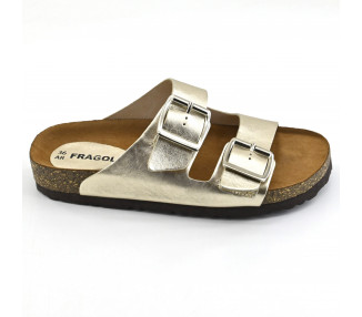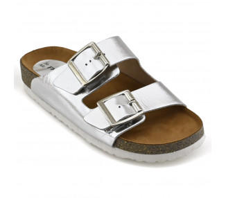 Sandalia birk de doble faja con hebilla. Capellada de cuero metalizado. Plantilla de gamuza y suela plataforma con base de goma.