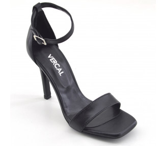 Sandalia tipo zueco de faja amplia con apliques de tachas. Realizada en material sintético. Fondo con taco cuadrado forrado y suela sintética.