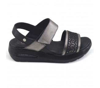 Botineta de cuero de mujer. Capellada de cuero con detalles metalizado y texturado en áreas de caña y talón. Sistema de cordones y cierre lateral. Base con plataforma y sutil elevación en altura.