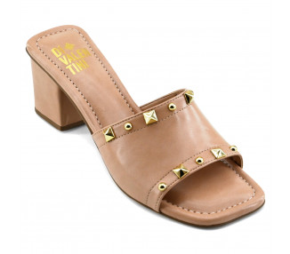 Sandalia tipo zueco de faja amplia con apliques de tachas. Realizada en material sintético. Fondo con taco cuadrado forrado y suela sintética.