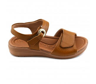 Sandalia de cuero graneado con base de goma. Capellada de faja principal y faja pulsera con abrojo. Plantilla confortable de goma flex con plataforma.