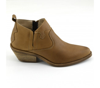 Botineta corta tipo charrito, en cuero, con acceso elastizado. Fondo en suela sintética con taco folia.