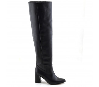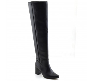 Bota biker de cuero de estilo de montar. Con diseño en costura sobre caña y detalle de estribo con tachas y hebilla. Base en suela con taco bajo y puntera cuadrada.