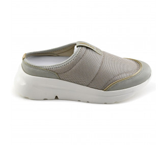 Zapato clásico de talón descubierto. Confeccionado en materiales sintéticos. Puntera y laterales cerrados con talón descubierto. Acceso y ajuste mediante tira con elástico detrás del talón. Taco cono forrado y base sintética.