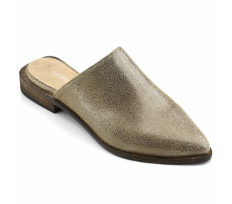 Mules confeccionado en cuero recubierto en glitter. Base de cuero Flex rústica con taco de 2 cm de altura. Se sugiere llevar un talle más que el habitual.