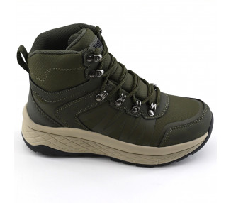 Botineta casual en cuero graneado, estampado y metalizado. Caña baja y acceso con cierre en lado interno y cordones con alpinos. Suela plataforma sintética liviana con cámara de aire.
