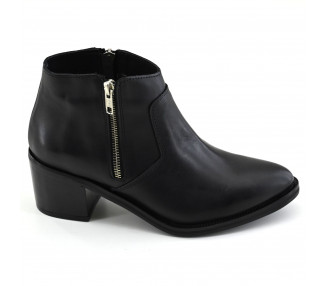 Confeccionada en cuero. Caña media baja con acceso por cierre lateral. Detalle de correa textil ajustable con hebilla alrededor del tobillo. Suela con taco folia.