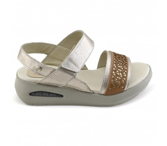 Sandalia birk de doble faja con hebilla. Capellada de cuero metalizado. Plantilla de gamuza y suela plataforma con base de goma.