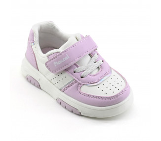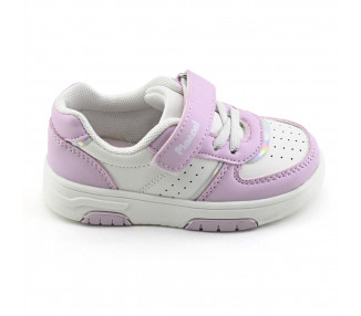 Zapatilla infantil de materiales sintéticos con detalles tornasolados. Acceso con cordones y detalle de cordón metalizado decorativo. Suela plataforma robusta.