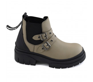 Bota de mujer en cuero. Caña baja con laterales elastizados. Cintos con ojales y hebillas. Suela plataforma de goma, con taco.