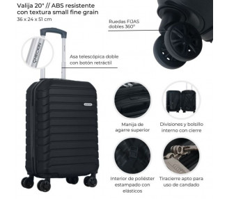 Valijas HARD CHECK IN Negro 20 pulg 4 ruedas dobles y manija metalica extensible. Marca: Check in Tipo: Rígida Material: ABS Medida: 20''