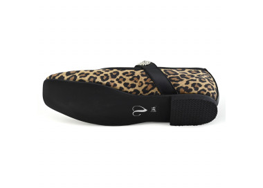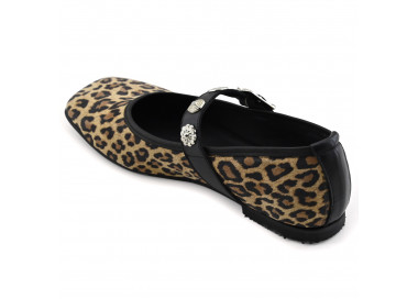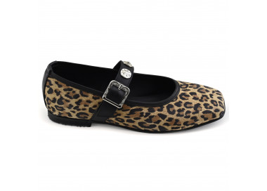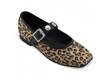 Zapato estilo balerina en cuero charolado. Tiras sobre empeine y en tobillo con hebilla. Suela con taco ultra chato.