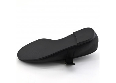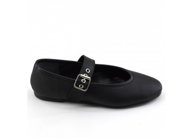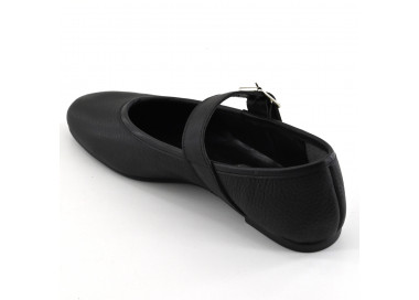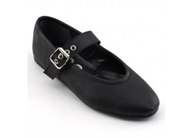 Zapato estilo balerina en cuero charolado. Tiras sobre empeine y en tobillo con hebilla. Suela con taco ultra chato.