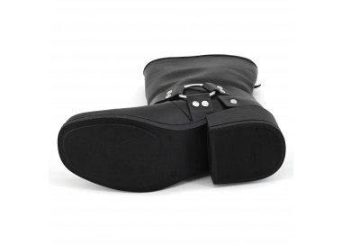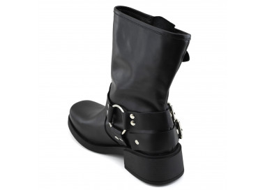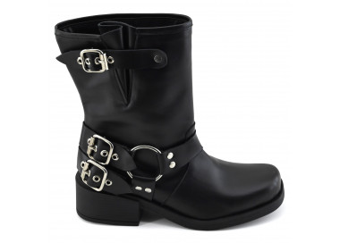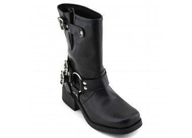 Bota de estilo biker con manga arrugada y detalle de hebillas. Caña de altura media con acceso amplio. Fondo en suela con base sintética.