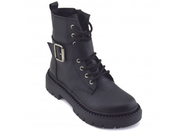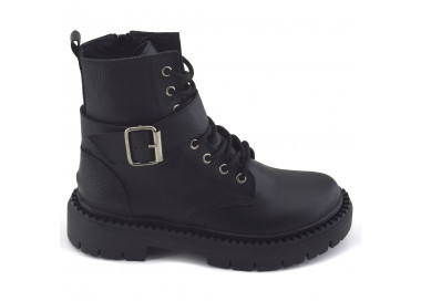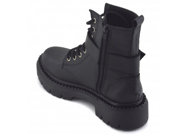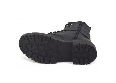 Borcego con plataforma que se destaca por su distintivo estilo combat boot, caña de altura media y punta redondeada.