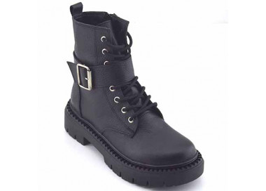 Borcego de mujer en cuero, caña media. Base de goma. Detalle de remaches redondos, ojalillos y avio marcario.
