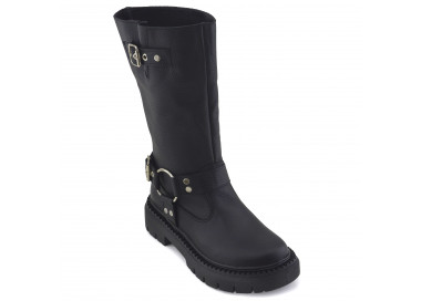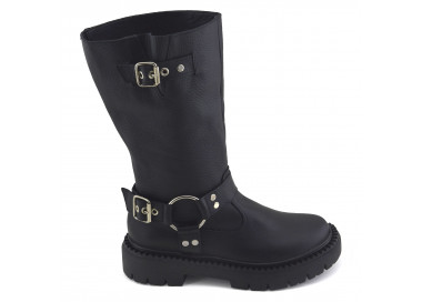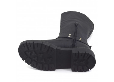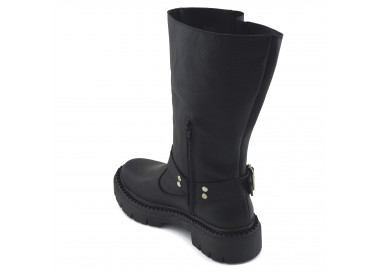 Borcego de caña alta con detalle de solapa y cierre. Material: eco cuero. Medidas: altura de base atrás 5,5 cm y adelante 4,5 cm. Largo de caña 35 cm.