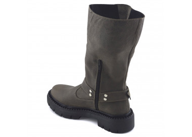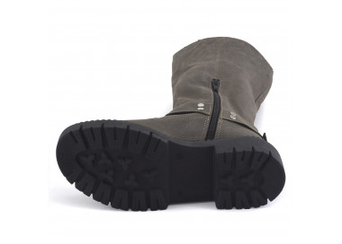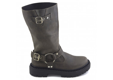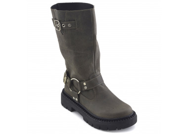 Borcego de cuero graneado. Caña media con cierre, cordones, y detalle de cintos con ojales y hebillas. Suela plataforma sintética con taco.
