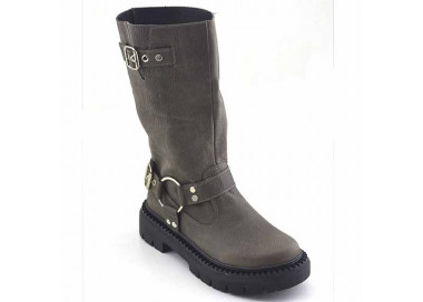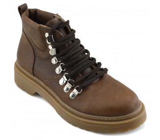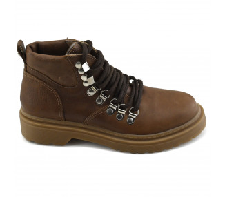Borcego de cuero. Caña corta con almohadilla en acceso. Sistema de cordones con alpinos. Base plataforma sintética con taco bajo.