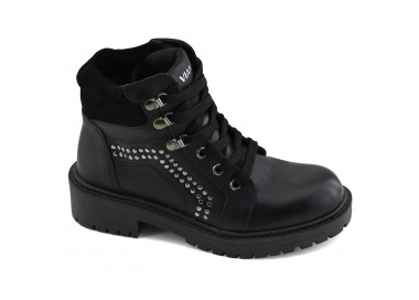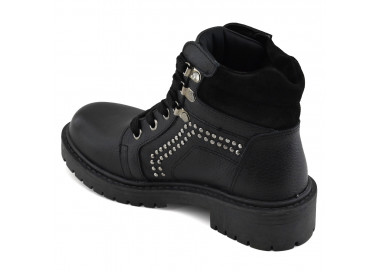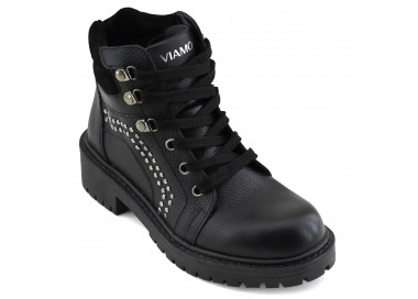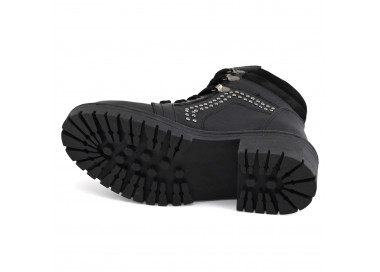 Borcego con plataforma que se destaca por su distintivo estilo combat boot, caña de altura media y punta redondeada.