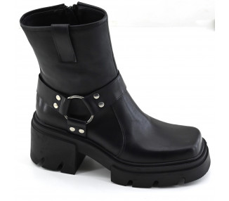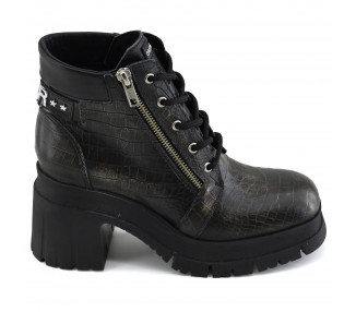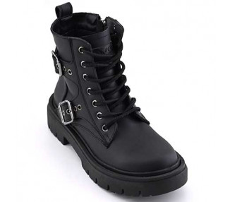 Borcego de cuero graneado metalizado. Caña media acordonada con cierre lateral y detalle de cintos con hebillas. Suela plataforma sintética.
