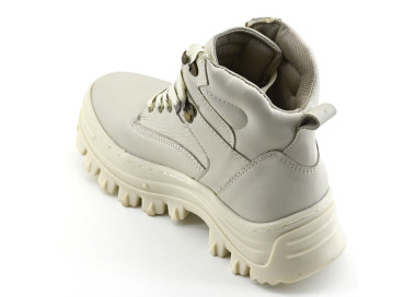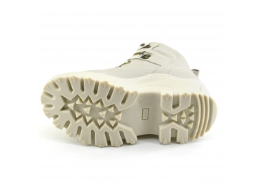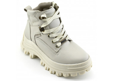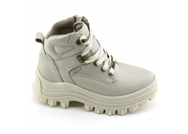 Borcego de cuero. Caña corta con almohadilla en acceso. Sistema de cordones con alpinos. Base plataforma sintética con taco bajo.