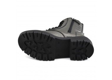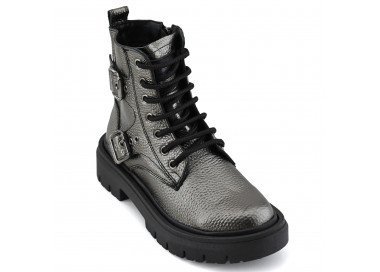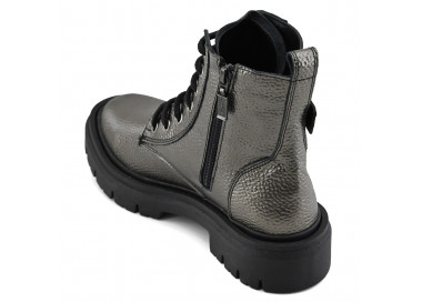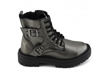 Borcego de cuero graneado metalizado. Caña media acordonada con cierre lateral y detalle de cintos con hebillas. Suela plataforma sintética.