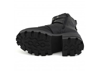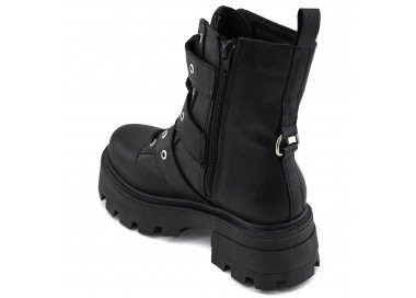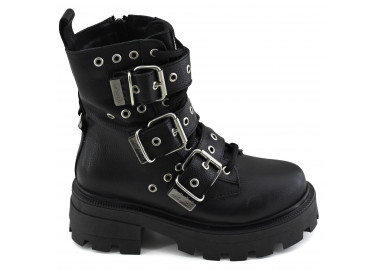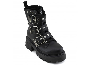 Caña media con cierre, cordones, y detalle de cintos con ojales y hebillas.