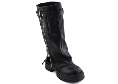 Borcego de cuero listo con canutillos plata. Caña media con cierre lateral y cordones alpinos. Suela plataforma sintética con taco.