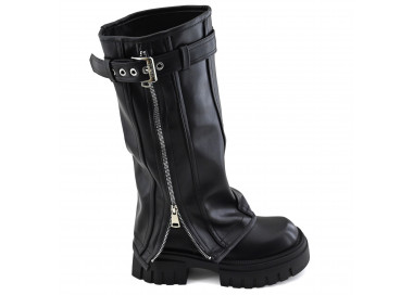 Borcego de cuero graneado metalizado. Caña media acordonada con cierre lateral y detalle de cintos con hebillas. Suela plataforma sintética.