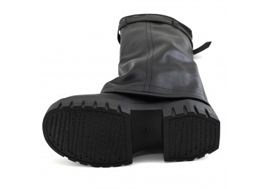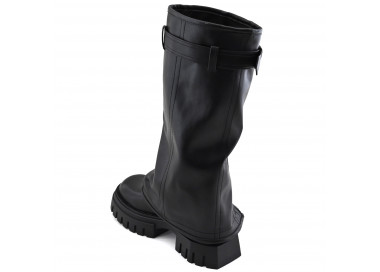 Borcego de cuero gastado y punta cuadrada con recortes. Detalle de cinturón con hebilla en capellada. Base TR de goma y madera. Taco folia de 5 cm.