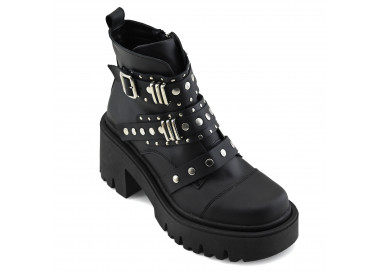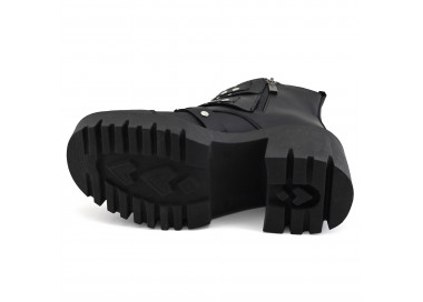 Borcego de cuero. Caña corta con almohadilla en acceso. Sistema de cordones con alpinos. Base plataforma sintética con taco bajo.