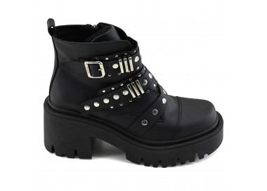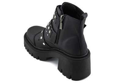 Borcego de cuero con puntera. Caña media baja acordodada, con cierre en lateral. Detalles de tachas y aplique con logo de la marca. Suela sintética de estilo leñador con taco medio.