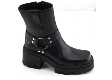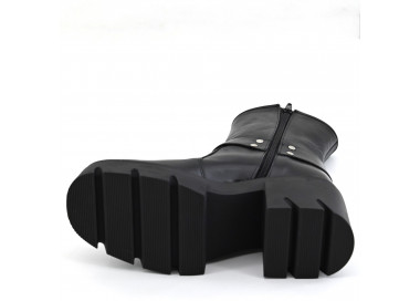 Borcego de cuero graneado. Caña media con cierre, cordones, y detalle de cintos con ojales y hebillas. Suela plataforma sintética con taco.