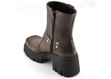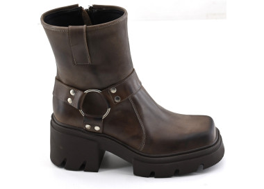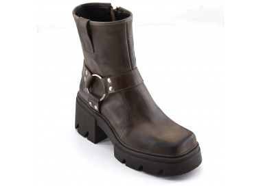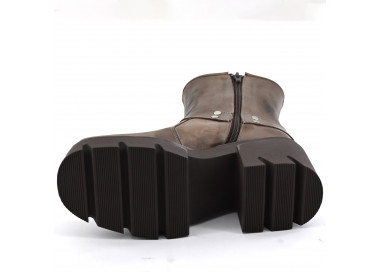 Borcego con plataforma que se destaca por su distintivo estilo combat boot, caña de altura media y punta redondeada.