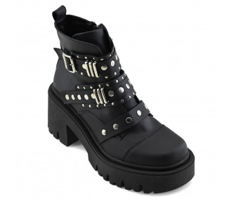 Borcego de cuero gastado y punta cuadrada con recortes. Detalle de cinturón con hebilla en capellada. Base TR de goma y madera. Taco folia de 5 cm.