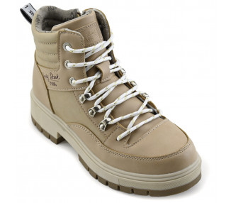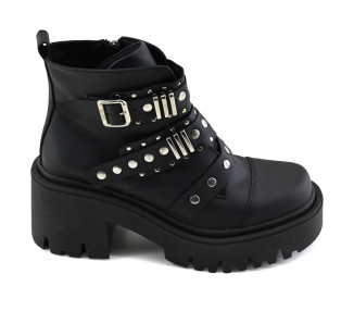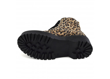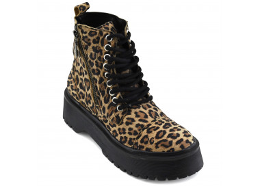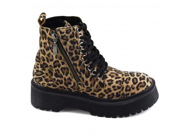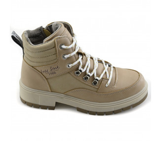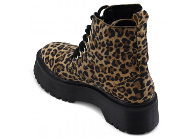 Borcego de cuero. Caña corta con almohadilla en acceso. Sistema de cordones con alpinos. Base plataforma sintética con taco bajo.