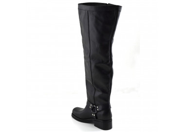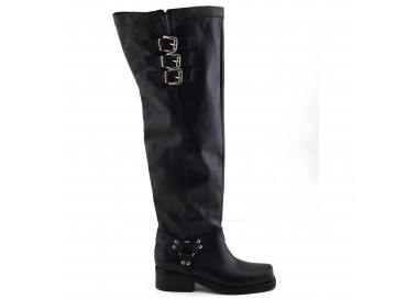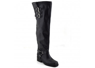 Bota estilo borcego en cuero graneado. Caña media alta con dos cierres metálicos en frente y cinto regulable con abrojo. Base plataforma sintética con taco.