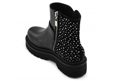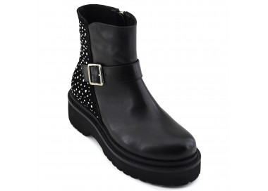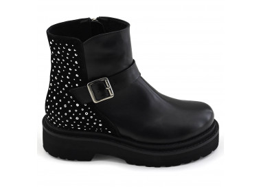 Botineta de cuero con detalle de cinto con tachas y hebilla. Caña corta con cierre lateral. Detalle de pieza metálica en puntera.