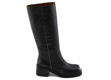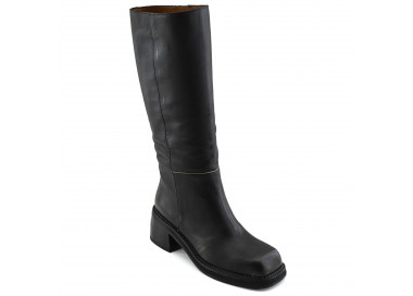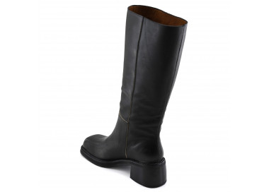Bota de estilo biker realizada en cuero liso. Acceso libre por caña amplia con detalle de cintos con hebilla y estribo. Suela con taco foliado y base sintética.