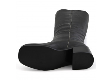 Bota biker de cuero de estilo de montar. Con diseño en costura sobre caña y detalle de estribo con tachas y hebilla. Base en suela con taco bajo y puntera cuadrada.