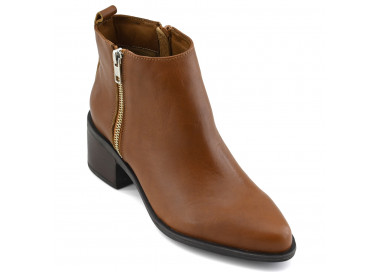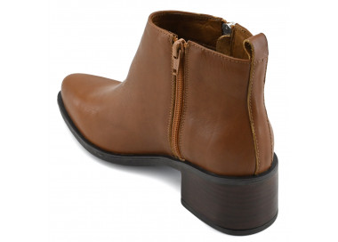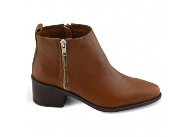 Botineta de cuero liso y caña baja de acceso por cierres laterales. Fondo en suela y taco folia.
