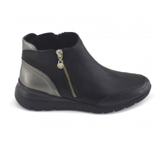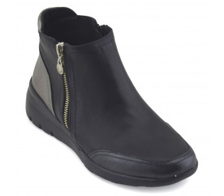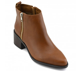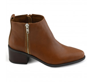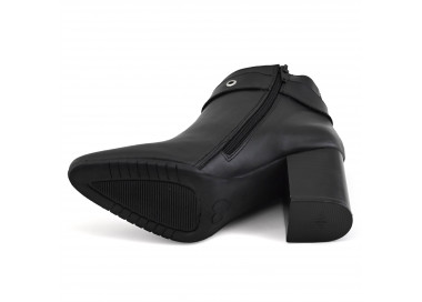 Botineta de cuero de caña baja con doble cierre. Base sintética con taco foliado.
