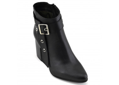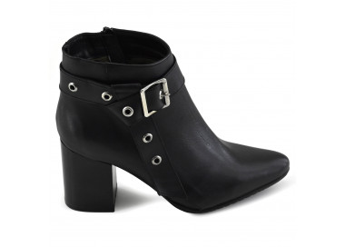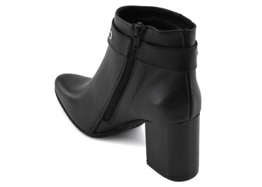 Botineta de mujer en cuero graneado. Caña baja con detalle de cinto con hebilla y acceso por cierre lateral. Base sintética con taco medio bajo.