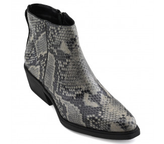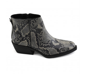 Bota de mujer caña baja en cuero graneado simil reptil, en punta. Forrería textil. Detalle de cierre en lado interno. Base de goma. Horma estándar. Medidas: altura de caña 10,5 cm y altura de taco 4,5 cm.