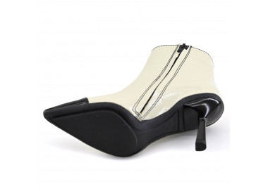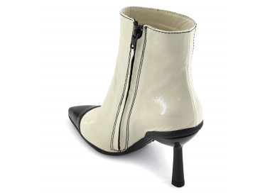 Botineta minimalista de cuero. Caña media corta con cierre lateral en lado interior. Fondo en suela con taco vainilla forrado en parte trasera. Suelín sintético.