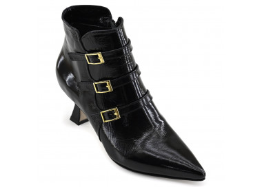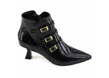 Botineta de cuero con detalle de cinto con tachas y hebilla. Caña corta con cierre lateral. Detalle de pieza metálica en puntera.