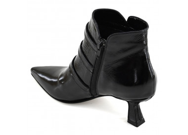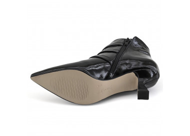 Botineta en cuero de acabado metalizado texturado. Caña corta con cierre lateral. Suela con taco forrado y suelín sintético.