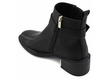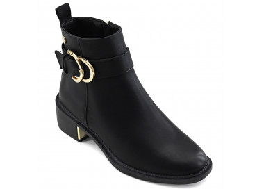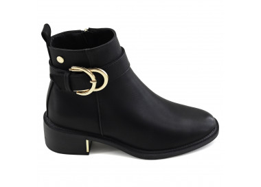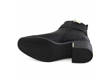 Suela sintética y taco bajo con detalle de pieza metalizada.