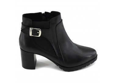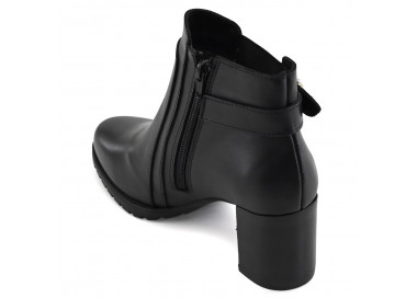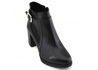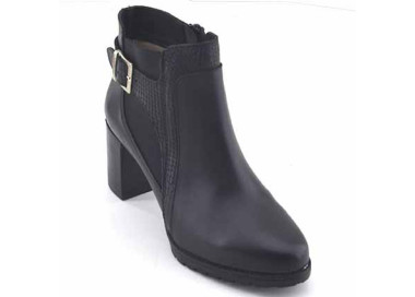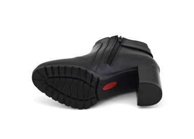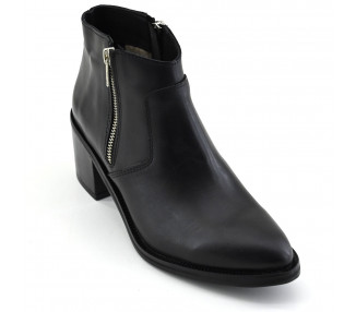 Botineta de cuero liso y caña baja de acceso por cierres laterales. Fondo en suela y taco folia.